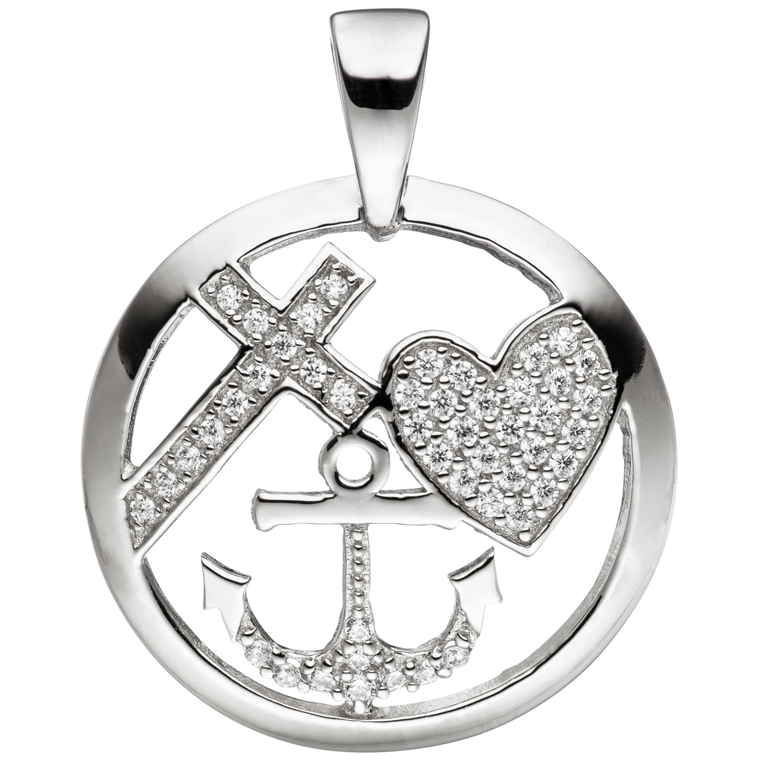 Anhänger 'Glaube, Liebe, Hoffnung' aus 925 Sterlingsilber, rhodiniert, mit Zirkonia, Höhe ca. 25,6 mm, Breite ca. 20,1 mm, Tiefe ca. 1,7 mm, Innenmaße der Öse ca. 4,4 mm x 3,1 mm, Gewicht ca. 2,1 g * Der Artikel ist anlaufgeschützt (rhodiniert) * Bitte beachten Sie die Maße! Auf dem Foto kann der Artikel größer wirken *