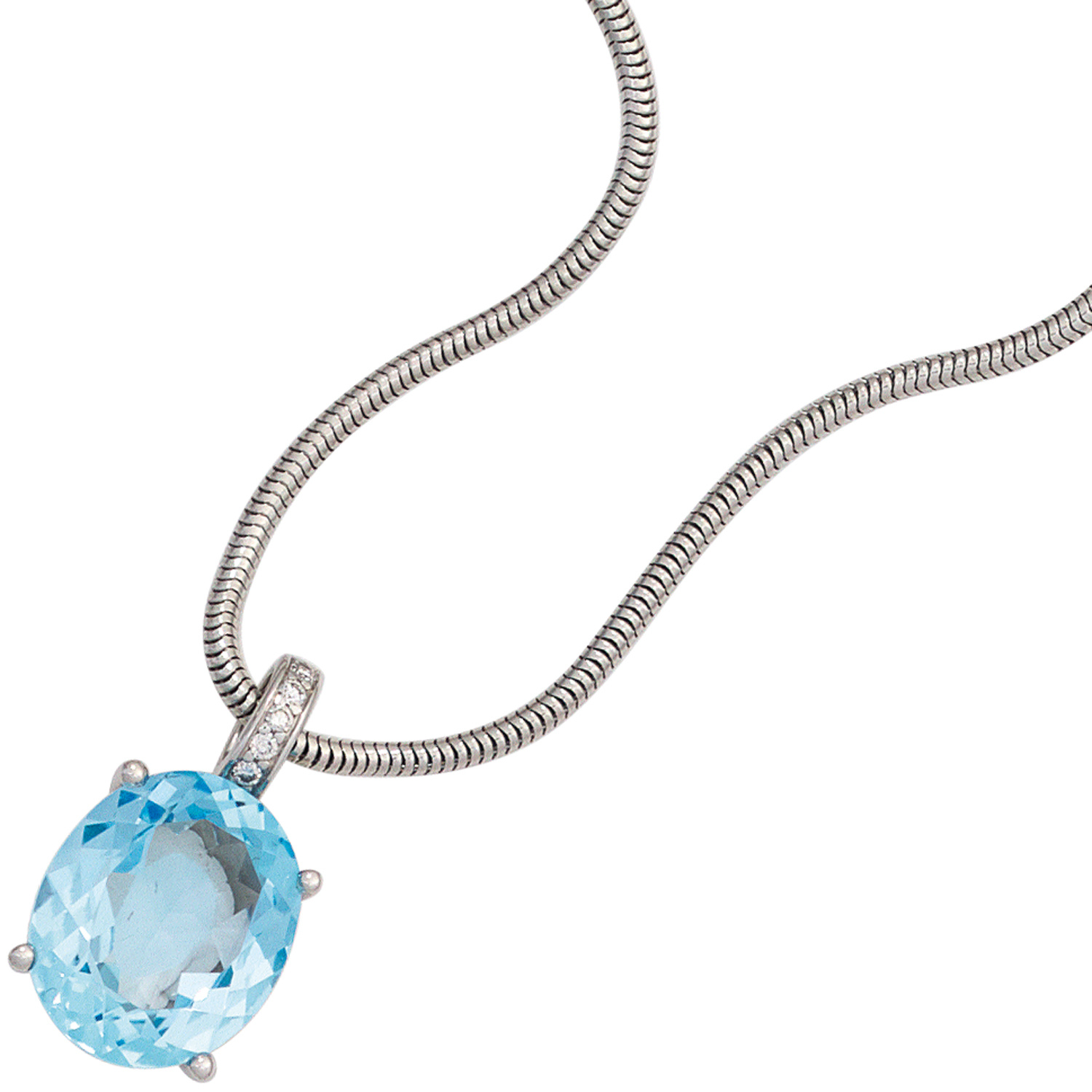 Anhänger ohne Kette aus 14 Karat (585) Weißgold, mit einem behandelten Blautopas und 5 Diamant-Brillanten, 0,03 ct., W/SI wesselton (weiß), SI=(kleine, mit bloßem Auge nicht erkennbare natürliche Einschlüsse), Feinbearbeitung gut, Höhe ca. 17,5 mm, Breite ca. 9,9 mm, Tiefe ca. 6,4 mm, Innenmaße der Öse ca. 4 mm x 2,5 mm, Gewicht ca. 2,3 g * Bitte beachten Sie die Maße! Auf dem Foto kann der Artikel größer wirken *