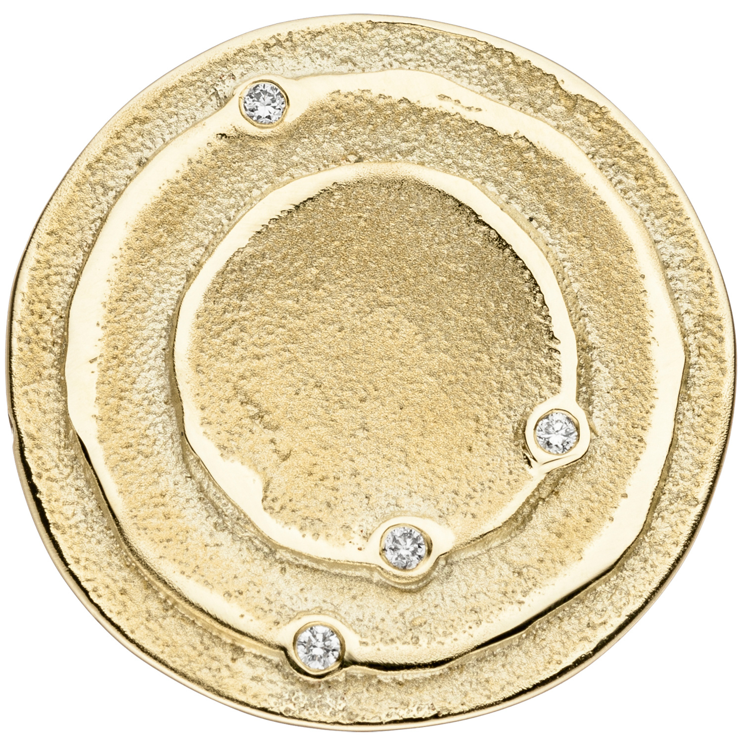 Anhänger aus 14 Karat (585) Gelbgold, teilmattiert, mit 4 Diamant-Brillanten, 0,04 ct., W/SI wesselton (weiß), SI=(kleine, mit bloßem Auge nicht erkennbare natürliche Einschlüsse), Feinbearbeitung gut, Durchmesser ca. 21,4 mm, Tiefe ca. 4,2 mm, Innenmaße der Öse ca. 2,9 mm x 2,2 mm, Gewicht ca. 4,4 g * Bitte beachten Sie die Maße! Auf dem Foto kann der Artikel größer wirken *