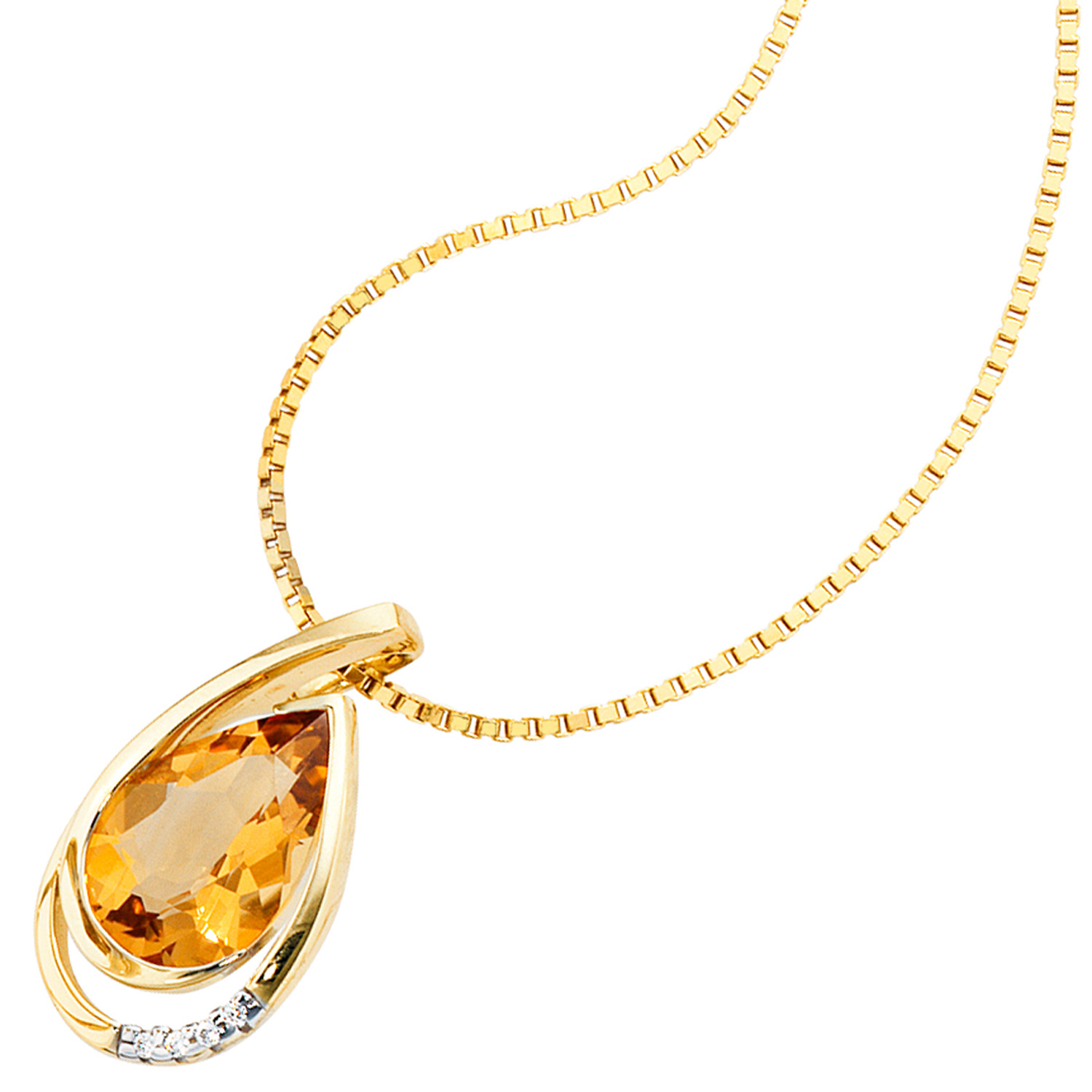 Anhänger aus 14 Karat (585) Gelbgold, teilrhodiniert, mit einem Citrin und 4 Diamant-Brillanten, 0,02 ct., W/SI wesselton (weiß), SI=(kleine, mit bloßem Auge nicht erkennbare natürliche Einschlüsse), Feinbearbeitung gut, Höhe ca. 20,1 mm, Breite ca. 11 mm, Tiefe ca. 4,8 mm, Innenmaße der Öse ca. 3,4 mm x 2,7 mm, Gewicht ca. 2,9 g * Bitte beachten Sie die Maße! Auf dem Foto kann der Artikel größer wirken *