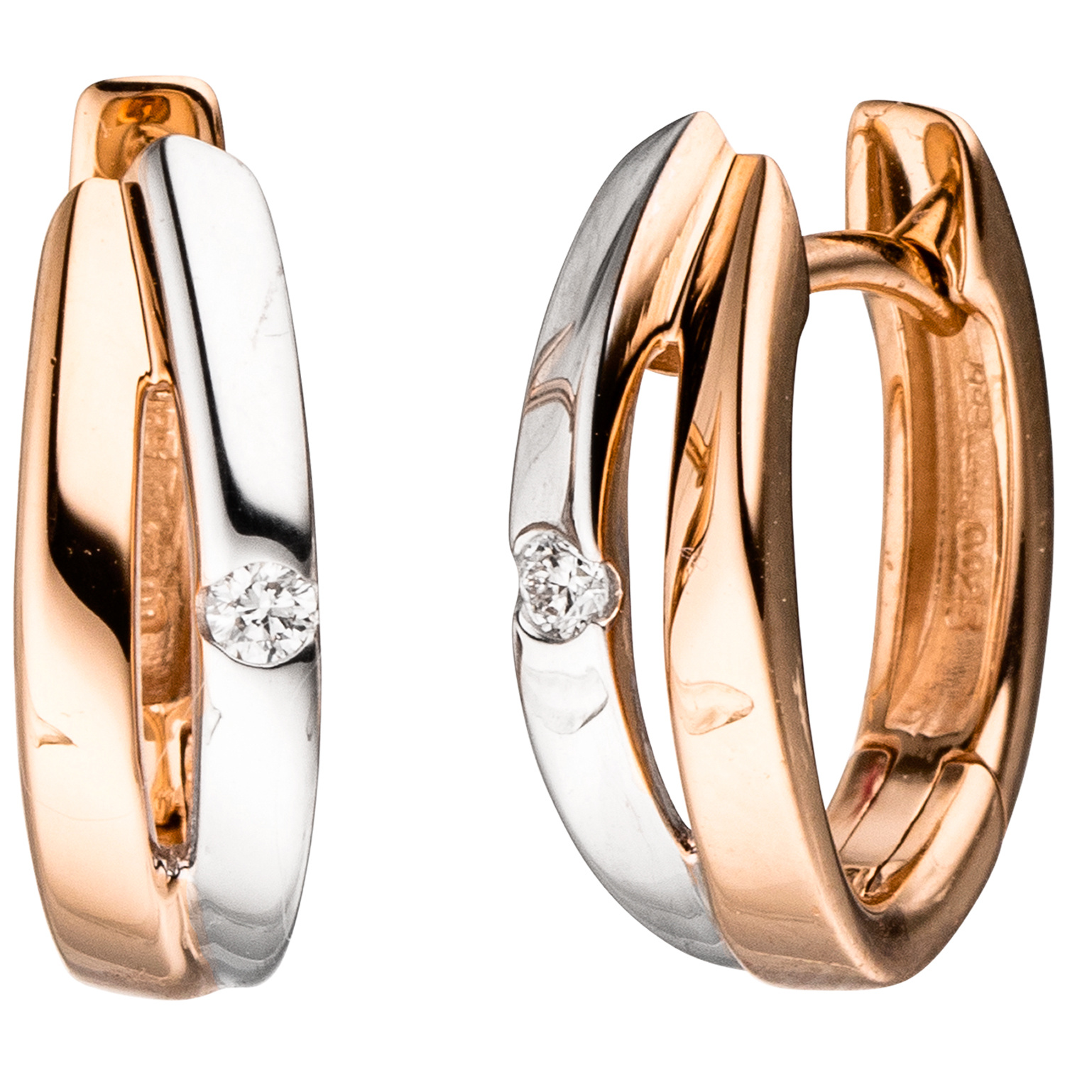 1 Paar Creolen mit Klappmechanik aus 14 Karat (585) Rotgold, teilrhodiniert, mit 2 Diamant-Brillanten, 0,05 ct., W/SI wesselton (weiß), SI=(kleine, mit bloßem Auge nicht erkennbare natürliche Einschlüsse), Feinbearbeitung gut, Höhe ca. 14,9 mm, Breite ca. 5 mm, Gewicht ca. 3,1 g * Bitte beachten Sie die Maße! Auf dem Foto kann der Artikel größer wirken *
