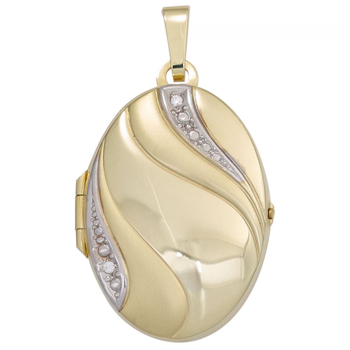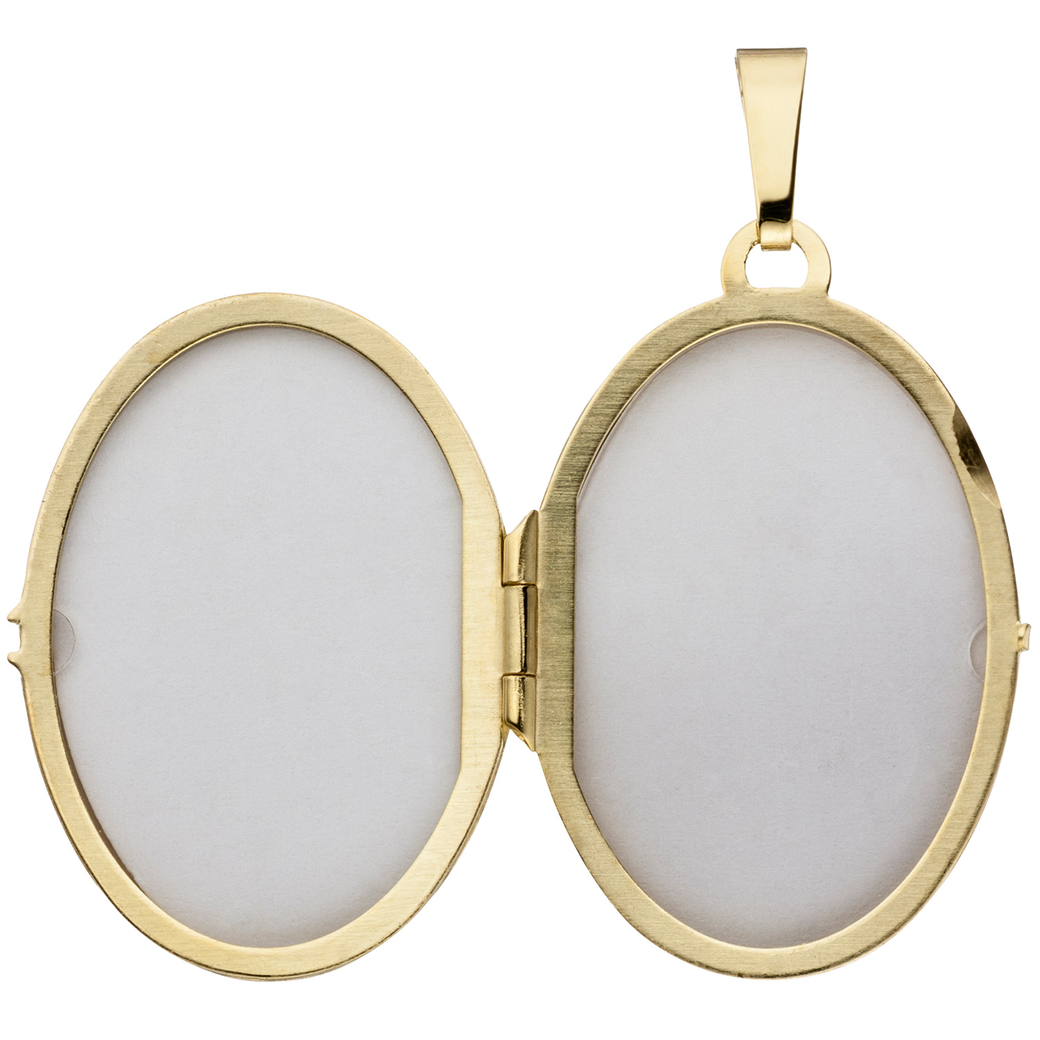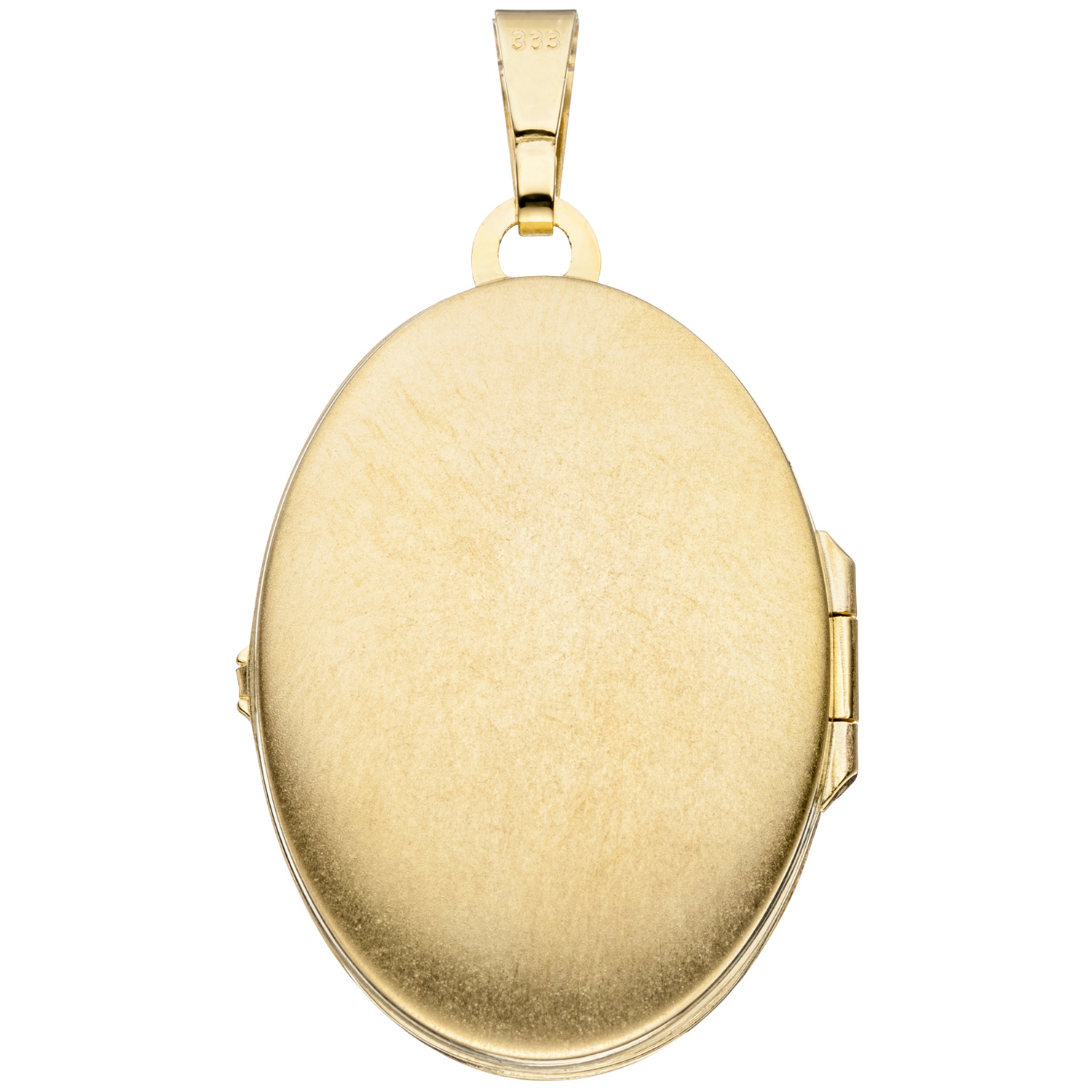 Ovales Medaillon für bis zu 2 Fotos aus 8 Karat (333) Gelbgold, teilrhodiniert und teilmattiert, mit 2 Zirkonia, Höhe ca. 31,1 mm, Breite ca. 21,6 mm, Tiefe ca. 6,2 mm, Innenmaße der Öse ca. 6,7 mm x 2,6 mm, Gewicht ca. 4,1 g * Bitte beachten Sie die Maße! Auf dem Foto kann der Artikel größer wirken *