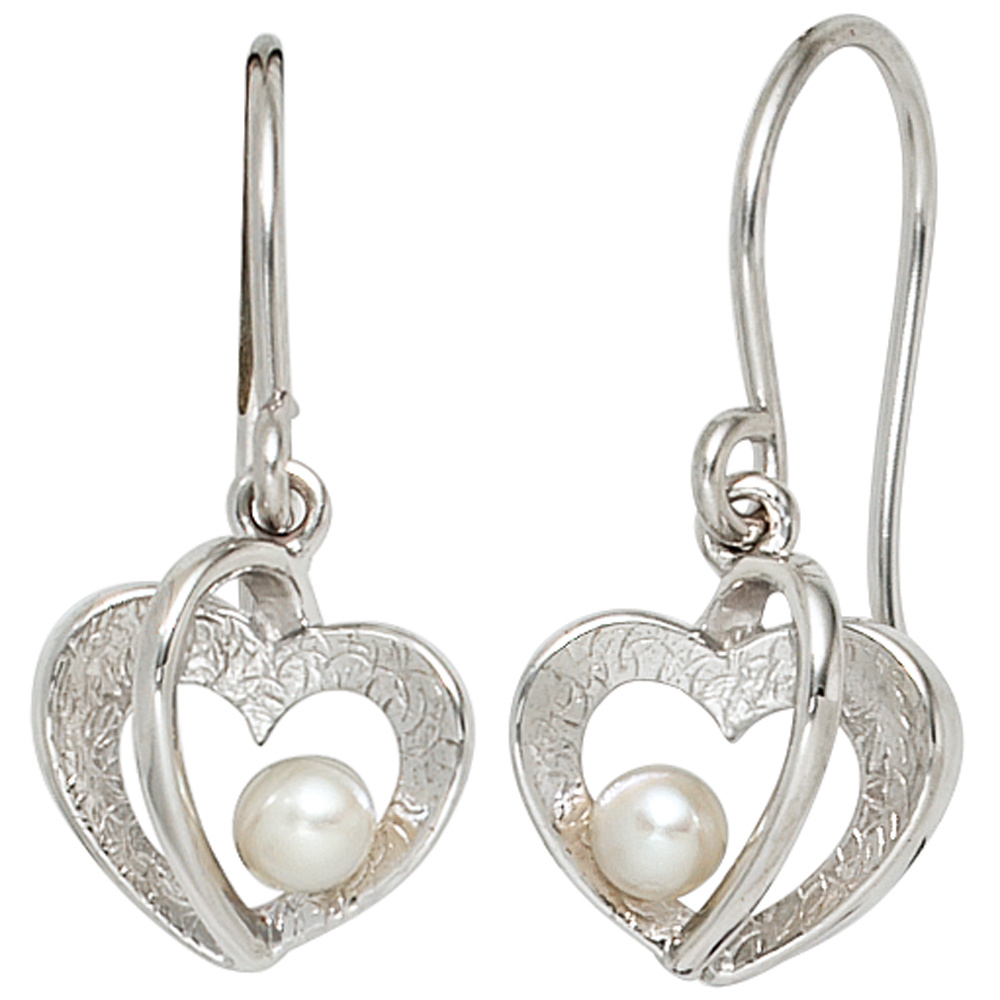 1 Paar Ohrhaken 'Herz' aus 925 Sterlingsilber, rhodiniert und teileismatt, mit 2 Süßwasser-Zuchtperlen, Höhe ca. 24,8 mm, Breite ca. 11,2 mm, Gewicht ca. 2,7 g * Der Artikel ist anlaufgeschützt (rhodiniert) * Bitte beachten Sie die Maße! Auf dem Foto kann der Artikel größer wirken *