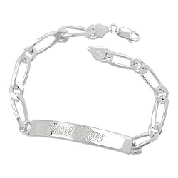 Identitätsarmband mit stabiler 1:1 Figarokette 6,5x2mm, sechsfach diamantiert. Die Gravurplatte 45x7x2,5mm trägt bereits die zeitlos schöne Lasergravur-Inschrift "Peace & Love". Auf der Rückseite kann eine persönliche Gravur hinzugefügt werden. Ein tolles Schmuckstück für ein ganz persönliches Geschenk zum Geburtstag, Jugendweihe, Konfirmation, Weihnachten oder einfach mal als kleine Überraschung zwischendurch.